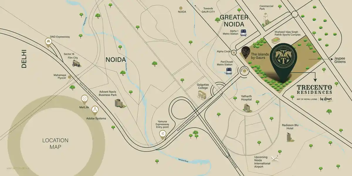 The Trecento Residences - By Gaurs gracefully ascends towards the heavens with an air of timeless elegance. Its unique cylindrical shape and appearance crafts a visual symphony seamlessly blending man-made luxury with nature's grandeur. This captivating scene stands as unmistakable as a beacon, visible and enchanting from miles afar.A testament to our passion for beauty and design, And a reflection of how Trecento's art still shines.